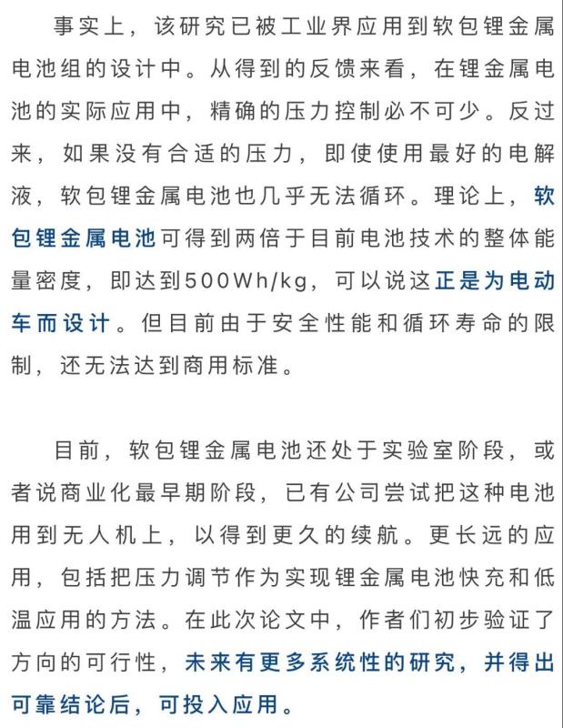 尤其是他們還發(fā)現(xiàn)即使使用比較大的充放電電流、或者進(jìn)行低溫充放,這時通過壓力控制,依然能得到非常致密的鋰沉積,這意味著鋰金屬電池也能進(jìn)行快充和低溫應(yīng)用,而這顛覆了業(yè)界之前普遍認(rèn)為鋰金屬用做快充會產(chǎn)生枝晶的認(rèn)知。如果能通過合適的工程方法,把這種壓力控制應(yīng)用到鋰金屬電池組的設(shè)計上,將會大大助力鋰金屬電池的安全商用化進(jìn)程。
