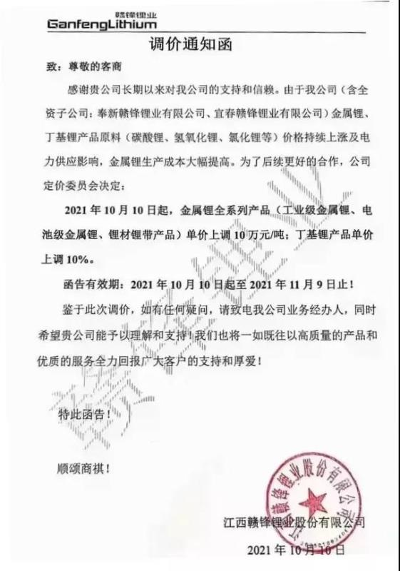 贛鋒鋰業(yè)發(fā)函稱,10月10日起,金屬鋰全系產(chǎn)品(工業(yè)級金屬鋰、電池級金屬鋰、鋰材鋰帶產(chǎn)品)單價上調(diào)10萬元/噸;丁基鋰產(chǎn)品單價上調(diào)10%。