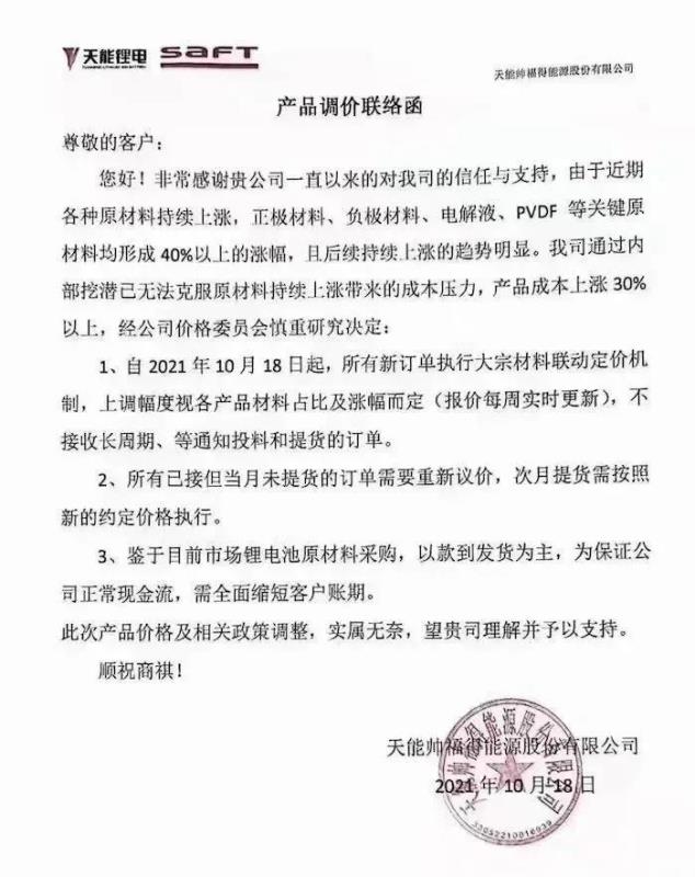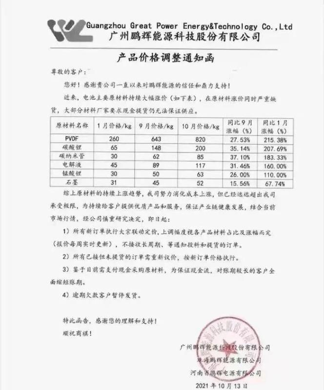 10月13日,鵬輝能源發(fā)函稱,公司羅列出主要電池材料的漲幅,決定所有新訂單將執(zhí)行大宗聯(lián)動定價,上調(diào)幅度視各產(chǎn)品材料占比及漲幅而定,報價每周實時更新,不接受長周期、等通知投料和提貨的訂單。此外還將對未提貨的訂單重新議價,并全面縮短賬期。