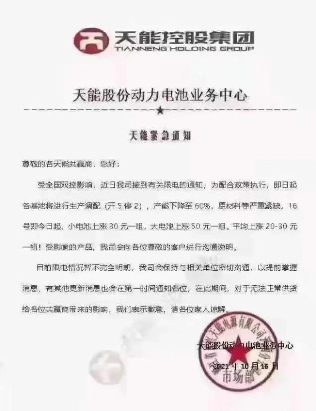 天能電池在緊急通知提到,10月16日起,小電池上漲30元一組,大電池上漲50元一組。平均上漲20-30元一組。