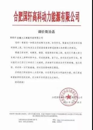 國軒高科10月18日向安徽大江新能源科技有限公司發(fā)函稱,隨著電芯原材料價格的持續(xù)上漲,動力電池企業(yè)目前面臨著新冠疫情以來的最大的難關(guān)。隨著正極材料、電解液、銅箔、鋁箔等的價格上揚(yáng),公司已盡最大努力來減少成本上揚(yáng)帶來的沖擊,但收效甚微。因此公司擬定就雙方已簽訂訂單進(jìn)行二次磋商。