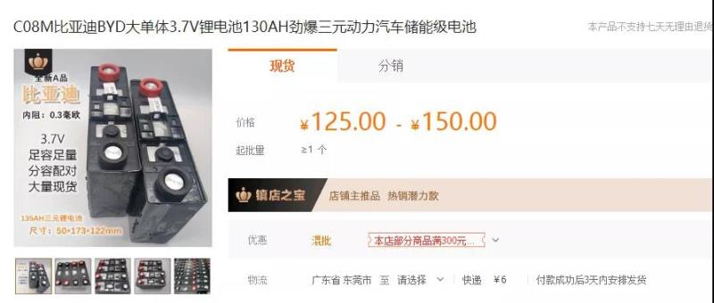 據(jù)了解,比亞迪C08M動力電池采用鎳鈷錳酸鋰作為正極材料,具有優(yōu)異的存儲性能及超長的循環(huán)壽命,電池工作溫度范圍廣,能量密度高,可用在通信備電、電動二/三輪車、儲能等領(lǐng)域。阿里巴巴1688網(wǎng)站上,該款電池的價格區(qū)間為125-150元。