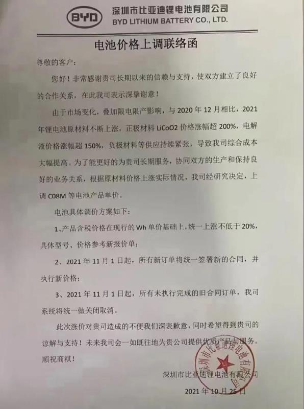 10月26日,一份比亞迪電池價格上調(diào)聯(lián)絡(luò)函在市場上傳開。