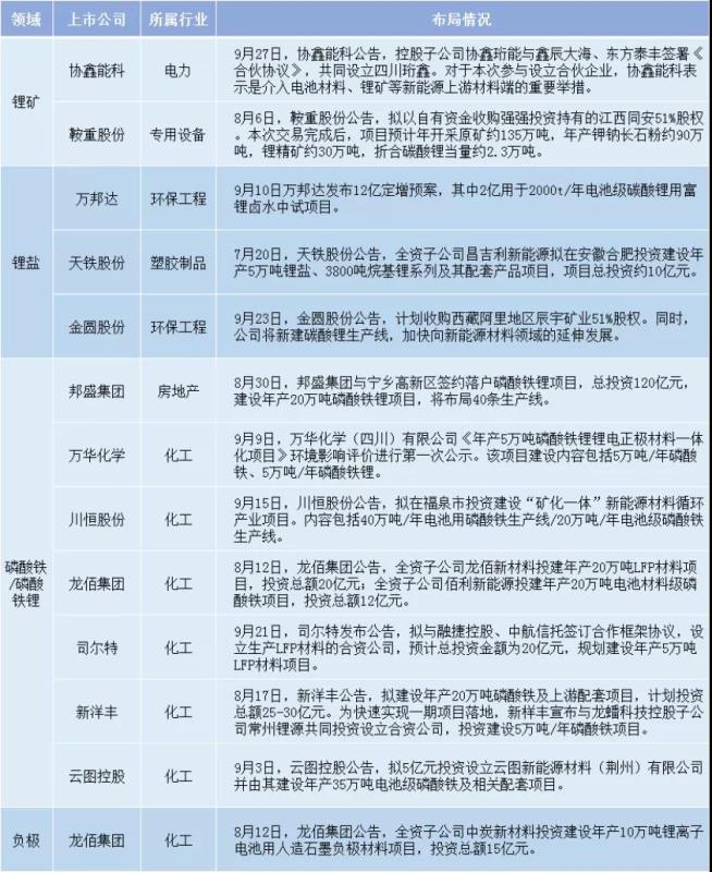 從布局方式看,尤其是在一些高門檻的細(xì)分領(lǐng)域,將面臨技術(shù)、認(rèn)證與市場競爭等風(fēng)險(xiǎn),目前新進(jìn)入的上市企業(yè)主要通過收購股權(quán)(鋰礦、隔膜、電池)或合資生產(chǎn)(磷酸鐵鋰)來布局。
