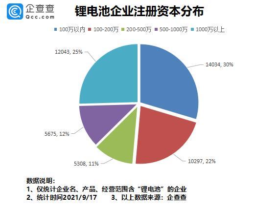 鋰電池相關(guān)企業(yè)注冊(cè)資本分布:1000萬(wàn)元以上的占比25%