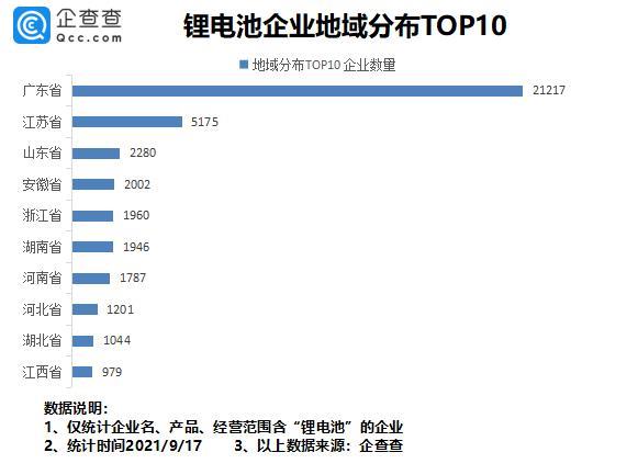 鋰電池相關(guān)企業(yè)省份分布:廣東企業(yè)最多,其次是江蘇、山東等省