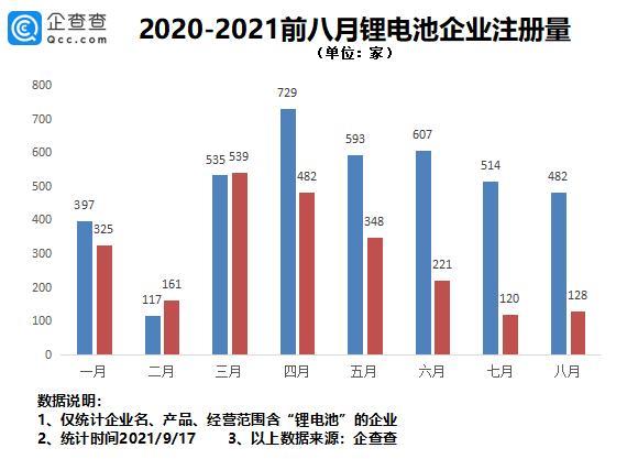企查查數(shù)據(jù)顯示,2021年前八個(gè)月,我國(guó)新增鋰電池相關(guān)企業(yè)共2324家。其中,3月份新增鋰電池企業(yè)最多,共539家;7月份新增鋰電池企業(yè)最少,僅120家。2020年前八個(gè)月中,4月為新增鋰電池相關(guān)企業(yè)最多,共729家。