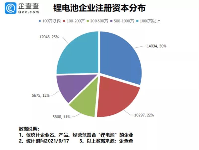 從注冊(cè)資本分布來(lái)看,鋰電池相關(guān)企業(yè)注冊(cè)資本在1000萬(wàn)以上的占比25%,共有1.2萬(wàn)家。注冊(cè)資本在100萬(wàn)以內(nèi)的有1.4萬(wàn)家,占比30%;100-200萬(wàn)的企業(yè)有1萬(wàn)家,占比22%;200-500萬(wàn)的企業(yè)有5308家,占比11%;500-1000萬(wàn)的鋰電池企業(yè)有5675家,占比12%。