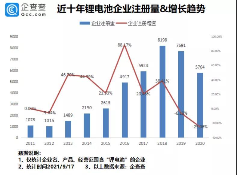 2018年新增8198家,同比增長(zhǎng)38.41%。是近十年來(lái)新增鋰電池企業(yè)最多的年份。2019年、2020年受補(bǔ)貼退坡以及新冠疫情等影響,分別新增鋰電池相關(guān)企業(yè)7691家、5764家,逐漸呈下滑趨勢(shì)。