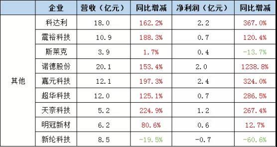 受益于新能源汽車市場需求爆發(fā),動力電池領域包括寧德時代、億緯鋰能、國軒高科、鵬輝能源實現(xiàn)營收凈利大幅增長。