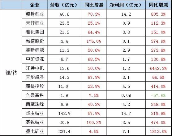 在14家涉及鋰、鈷、鎳材料的上市公司中,營收同比全部為正,13家企業(yè)實現(xiàn)營收同比大幅增長。