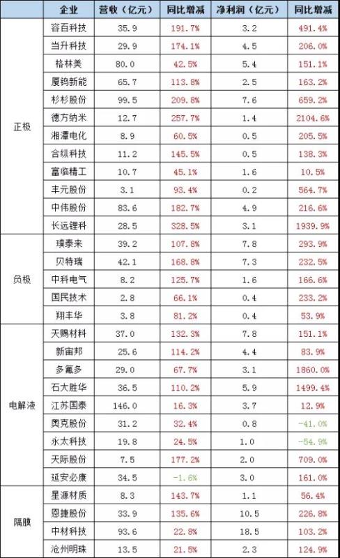 在負極材料領域,除了翔豐華之外,璞泰來、貝特瑞、中科電氣、國民技術凈利潤增長同比超160%以上。