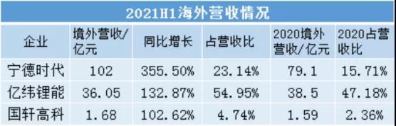 高工鋰電注意到,寧德時代、國軒高科、億緯鋰能2021年上半年境外營收出現(xiàn)翻倍式增長,同比增速在1-3.5倍,境外營收接近或已超過2020年全年。