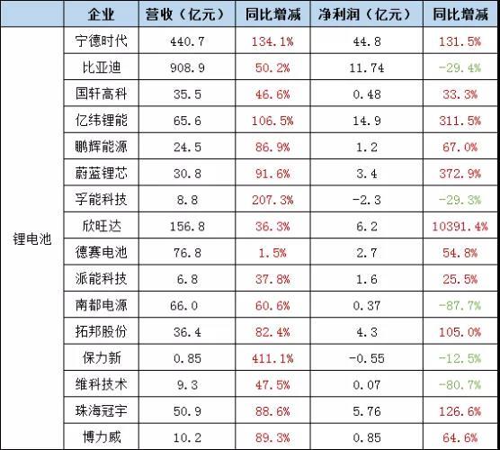 此外,受益于基站儲能、3C數(shù)碼、電動工具等細分市場的需求增長,鵬輝能源、派能科技、拓邦股份、蔚藍鋰芯、珠海冠宇等電池企業(yè)也實現(xiàn)了營收凈利雙重增長。