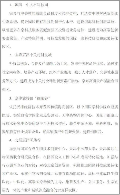圍繞“津城”、“濱城”雙城發(fā)展,推動從北京中關(guān)村到天津?yàn)I海沿線各區(qū)形成布局合理、要素密集、環(huán)境卓越、活力強(qiáng)勁的科技創(chuàng)新發(fā)展帶,加快高校和科技園等重要節(jié)點(diǎn)的創(chuàng)新發(fā)展,建設(shè)濱海—中關(guān)村科技園、寶坻京津中關(guān)村科技城等京津協(xié)同創(chuàng)新中心,支持東麗、津南、北辰、靜海等區(qū)打造京津微創(chuàng)新中心,輻射服務(wù)雄安新區(qū)建設(shè)。深化“通武廊”科技合作。推動北京、天津國家新一代人工智能創(chuàng)新發(fā)展試驗(yàn)區(qū)聯(lián)動發(fā)展。