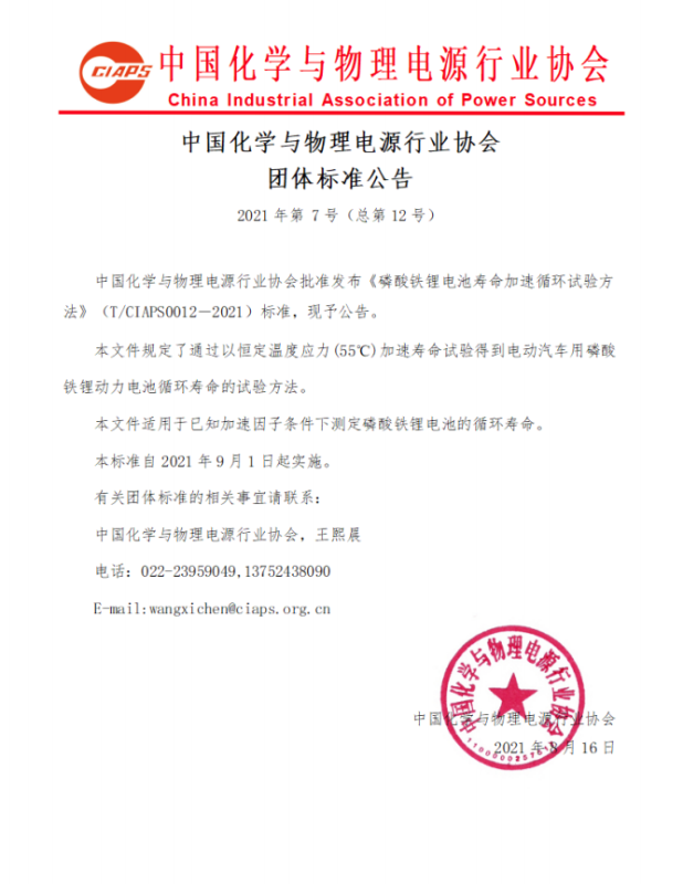 中國化學與物理電源行業(yè)協(xié)會批準發(fā)布《磷酸鐵鋰電池壽命加速循環(huán)試驗方法》(T/CIAPS0012―2021)標準,現(xiàn)予公告。