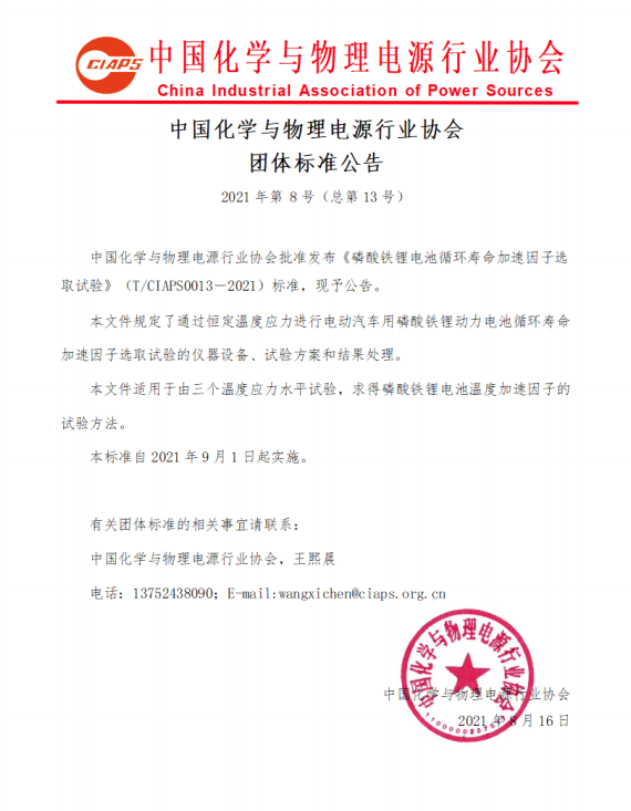 中國(guó)化學(xué)與物理電源行業(yè)協(xié)會(huì)批準(zhǔn)發(fā)布《磷酸鐵鋰電池循環(huán)壽命加速因子選取試驗(yàn)》(T/CIAPS0013―2021)標(biāo)準(zhǔn),現(xiàn)予公告。