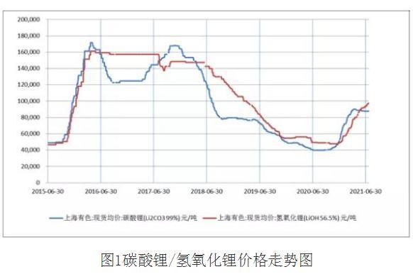 2021年上半年,碳酸鋰和氫氧化鋰市場價格均迎來了大幅的上漲。6月30日,上海有色碳酸鋰(99%)現(xiàn)貨價格為8.75萬元/噸,上半年累計上漲69.9%;氫氧化鋰(56.5%)價格為9.4萬元/噸,上半年累計上漲91.8%。氫氧化鋰價格實現(xiàn)對碳酸鋰的反超。