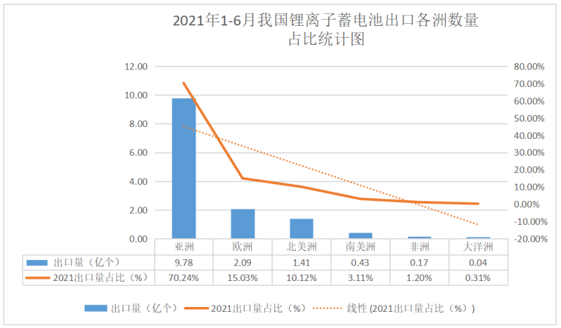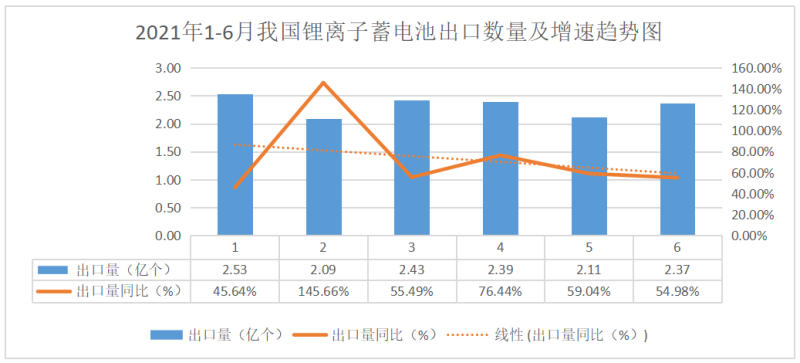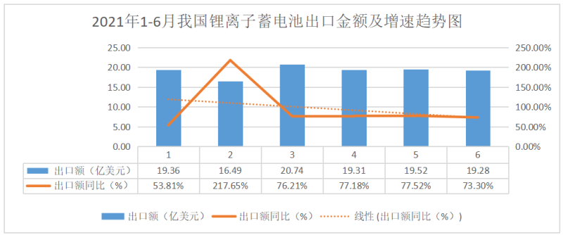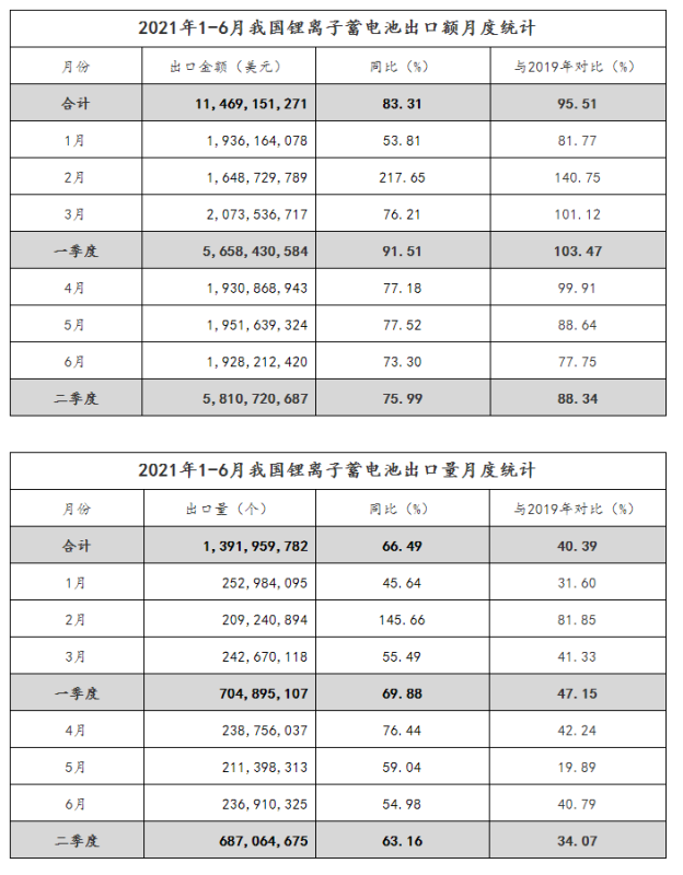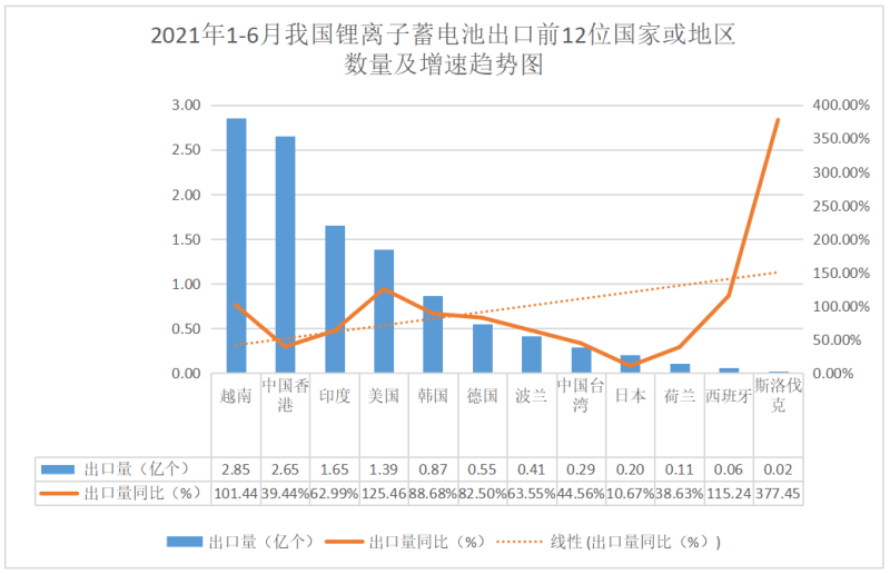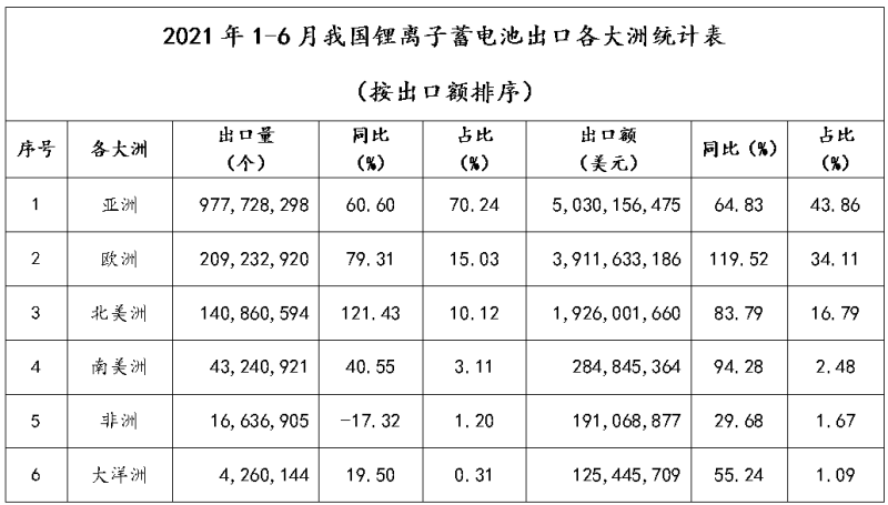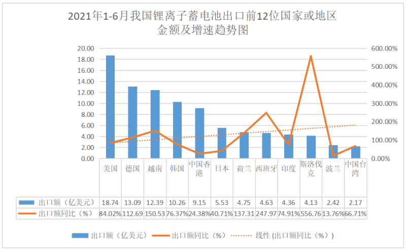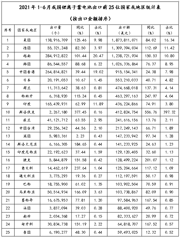 根據(jù)海關(guān)出口數(shù)據(jù)統(tǒng)計(jì)分析,2021年1-6月中國鋰離子電池出口額達(dá)到114.69億美元,同比增長83.31%;出口數(shù)量達(dá)到13.92億個(gè),同比增長66.49%。前十大出口目的地為美國、德國、越南、韓國、中國香港、日本、荷蘭、西班牙、印度、斯洛伐克,出口額合計(jì)為87.03億美元,占2021年1-6月出口總額的75.88%;出口數(shù)量合計(jì)為10.36億個(gè),占2021年1-6月出口總量的74.42%。