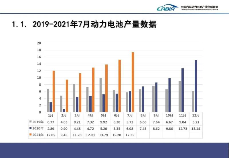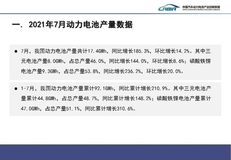 8月11日,中國汽車動力電池產(chǎn)業(yè)創(chuàng)新聯(lián)盟發(fā)布2021年7月動力電池月度數(shù)據(jù)。產(chǎn)量方面,2021年7月國內(nèi)動力電池在產(chǎn)量方面共計完成17.4GWh,同比大幅增長185.3%,環(huán)比增長14.2%。其中三元電池產(chǎn)量8GWh,占總產(chǎn)量46%,同比增長144%,環(huán)比增長8.6%;磷酸鐵鋰電池產(chǎn)量9.3GWh,占總產(chǎn)量53.8%,同比增長236.2%,環(huán)比增長20%。
