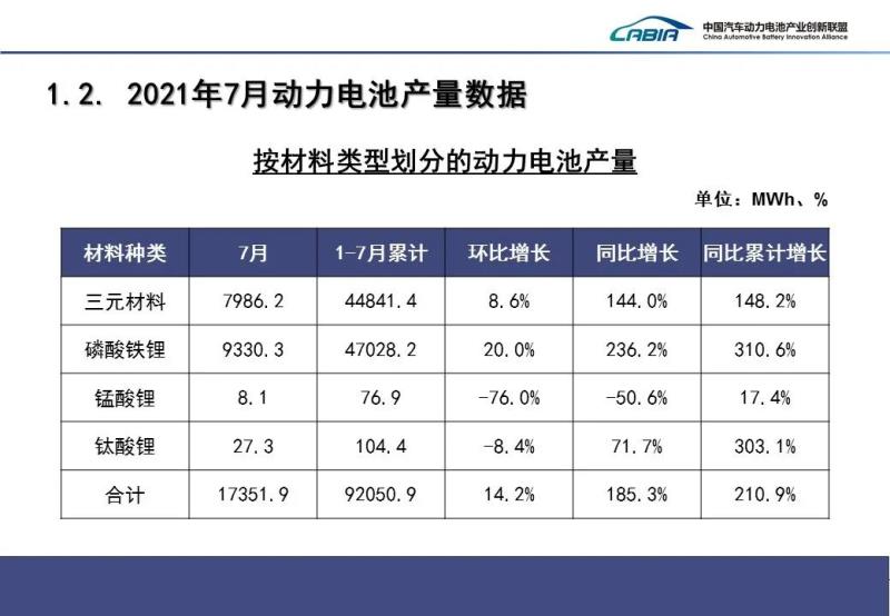 1-7月,我國動力電池產(chǎn)量累計92.1GWh,同比累計增長210.9%。其中三元電池產(chǎn)量累計44.8GWh,占總產(chǎn)量48.7%,同比累計增長148.2%;磷酸鐵鋰電池產(chǎn)量累計47GWh,占總產(chǎn)量51.1%,同比累計增長310.6%。