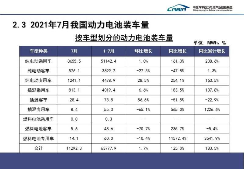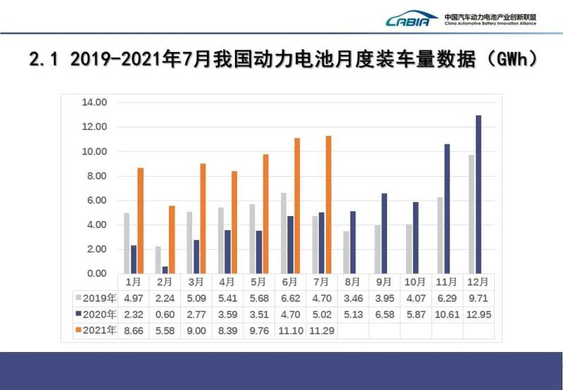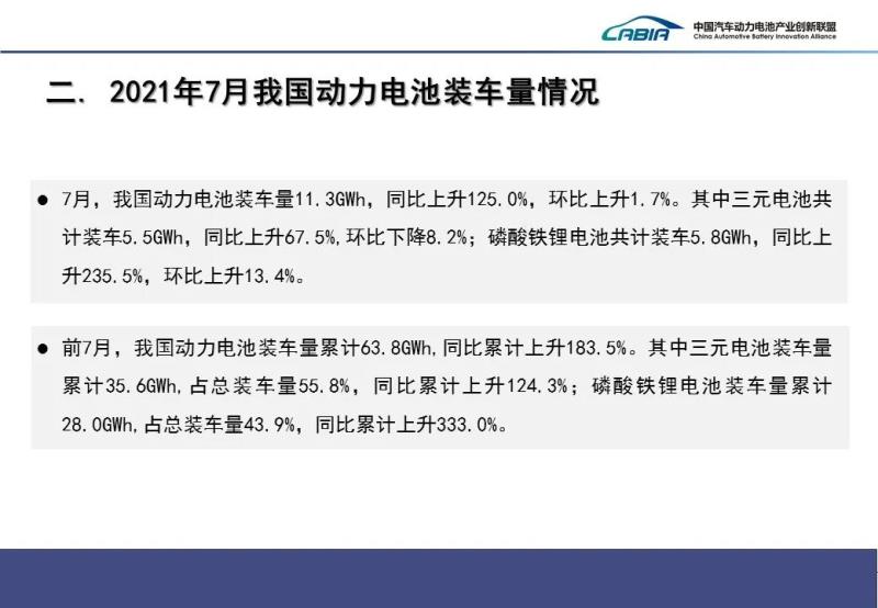 裝車量方面,2021年7月我國動力電池裝車量11.3GWh,同比上升125%,環(huán)比上升1.7%。其中三元電池裝車5.5GWh,同比上升67.5%,環(huán)比下降8.2%;磷酸鐵鋰電池共計裝車5.8GWh,同比上升235.5%,環(huán)比上升13.4%。