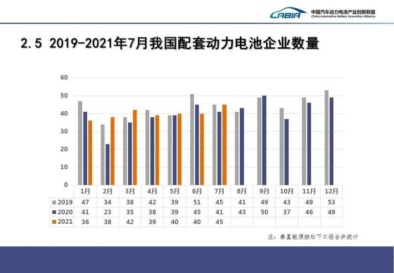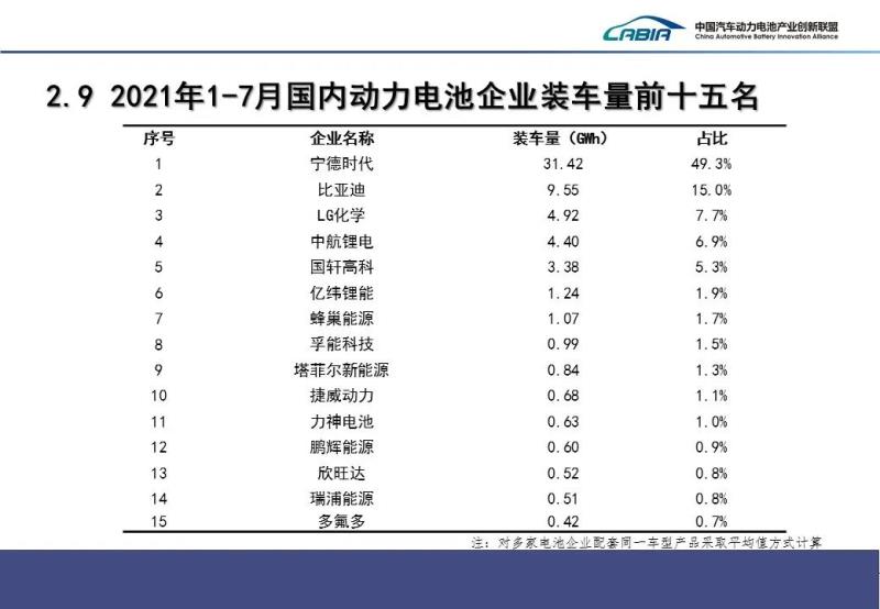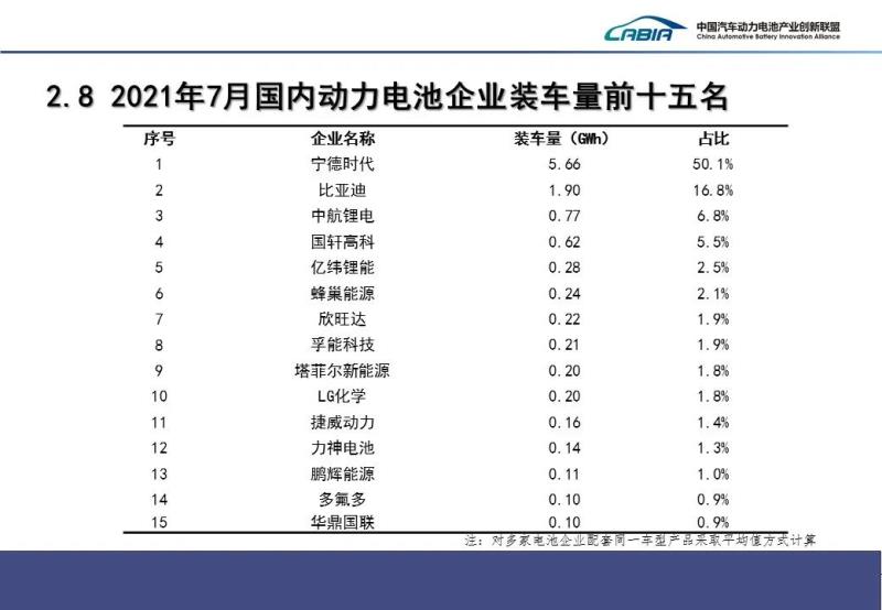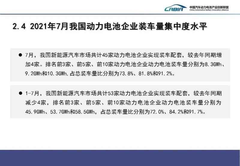 企業(yè)集中度方面,2021年7月,我國新能源汽車市場共計45家動力電池企業(yè)實現(xiàn)裝車配套,較去年同期增加4家。排名前3家、前5家、前10家動力電池企業(yè)動力電池裝車量分別為8.3GWh、9.2GWh和10.3GWh,占總裝車量比分別為73.8%、81.8%和91.2%。