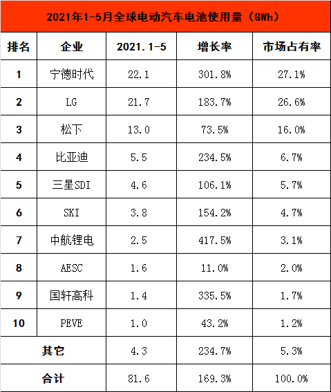 而且在市占率上,得益于5月的迅速攀升,LG能源解決方案與寧德時(shí)代的差距也進(jìn)一步縮小。今年1-5月,盡管寧德時(shí)代保住了市占率榜首的位置,但僅僅領(lǐng)先LG能源解決方案0.5%。這表明,在動(dòng)力電池廠商龍頭地位的爭(zhēng)奪上,異常激烈。