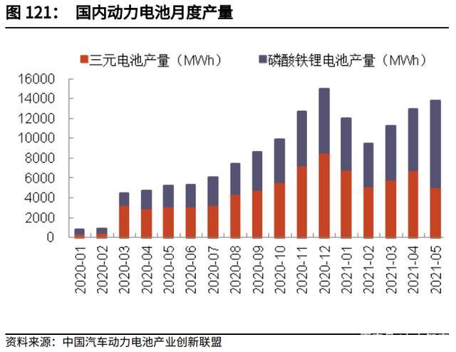 2020 年動力電池產(chǎn)量前低后高,2020 年二季度出現(xiàn)了減產(chǎn)的情況,之后逐月增 量,20Q4 高速增長,一直持續(xù)到 2021Q1。三元電池產(chǎn)量同比增長穩(wěn)健,主要 是磷酸鐵鋰電池產(chǎn)量快速增長,2020 年 12 月同比增速達到 452%。