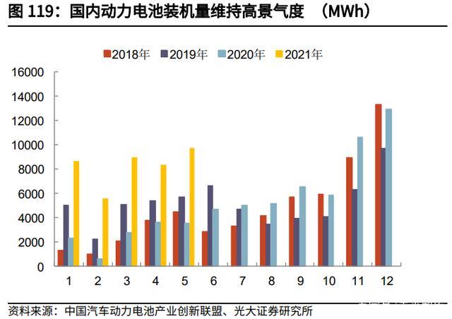 新能源汽車需求旺盛帶動了動力電池產(chǎn)業(yè)鏈公司的產(chǎn)量增長,2021 上半年鋰電 產(chǎn)業(yè)鏈公司均處于滿產(chǎn)狀態(tài),部分環(huán)節(jié)例如電解液、六氟磷酸鋰等甚至出現(xiàn)了產(chǎn) 能緊張、供不應(yīng)求的情況。正極、負極、隔膜、電解液企業(yè)月度產(chǎn)量環(huán)比不斷增 長。