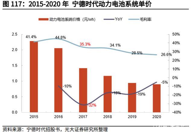 動力電池企業(yè)具有較強成本消化能力。以寧德時代為例,2017 年動力電池系統(tǒng) 價格為 1.41 元/Wh,同比下降 32%,2014-2017 年年均復(fù)合降幅為 21.3%。2017 年,由于受到下游補貼退坡和上游漲價的雙重壓力,電池系統(tǒng)平均價格同比下降 32%,而毛利率僅下降 9.5pcts,電池價格降幅大于毛利率降幅。未來動力電池降本趨緩,且下游市場化轉(zhuǎn)變不再依賴補貼,動力電池企業(yè)面臨的成本壓力僅來 自于上游漲價,盈利壓力相對較輕。