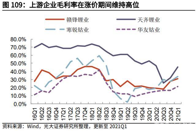 盈利情況與價格走勢基本一致。分環(huán)節(jié)來看,上游資源、正極材料、電解液這些 價格波動較大的環(huán)節(jié),毛利率走勢基本與價格一致,而負極材料、隔膜價格平穩(wěn) 且逐漸降價,毛利率情況穩(wěn)定。動力電池環(huán)節(jié)由于降本的下游應(yīng)用需要,毛利率 處于穩(wěn)步下降的趨勢。