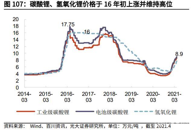 (1)根據(jù)鋰鹽的歷史價格,可以看出中國鋰鹽在 2015 年之前處于供需平衡狀 態(tài),碳酸鋰和氫氧化鋰的價格主要在 4 萬元/噸上下波動,整體變化不大。2015 年起,隨著中國新能源汽車的快速發(fā)展,國內(nèi)鋰鹽市場供小于求,鋰鹽價格大幅 快速上漲。2016 年電池級碳酸鋰的價格漲至近 18 萬元/噸。