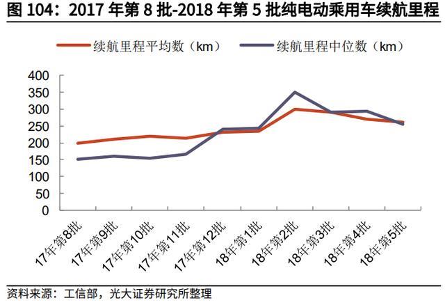 我們梳理了新能源汽車推薦目錄(2017 年第 8 批-2018 年第 5 批),新發(fā)布車 型和變更擴展車型中,純電動乘用車續(xù)航里程的均值和中位數(shù)總體表現(xiàn)出提升趨 勢,2017 年第 8 批-2018 年第 5 批,均值由 199km 提升至 277km,中位數(shù)由 155km 提升至 270km;純電動乘用車電池系統(tǒng)能量密度也表現(xiàn)出增長趨勢,均 值由 123Wh/kg 提升至 133Wh/kg,中位數(shù)由 126Wh/kg 提升至 135Wh/kg。