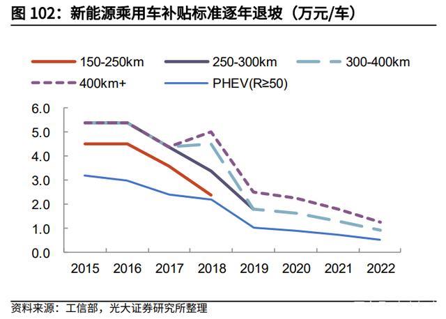1、補貼退坡:續(xù)駛里程不足 300 公里的純電動乘用車補貼減少 1~2.1 萬元;插 電混動乘用車補貼減少 0.2 萬元;純電動客車補貼減少 3~12 萬元;插電混動客 車補貼減少 3~12 萬元;專用車補貼上限減少 5 萬元;燃料電池汽車補貼不變。
