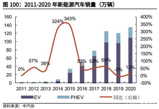 得益于我國強大的抗疫組織能力,2020 年我國新能源汽車銷量態(tài)勢良好,四月 起銷量便企穩(wěn)并不斷回升。根據(jù)中汽協(xié)數(shù)據(jù),2020 年我國新能源車銷量 136.7 萬輛,同比增長 10.9%。其中,純電動汽車銷量為 109.4 萬輛,同比增 11.6%; 插電式混合動力汽車銷量為 24.9 萬輛,同比增長 8.4%,電動車滲透率從 2019 年的 4.7%提升至 2020 年的 5.4%。