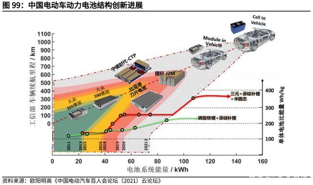 這些創(chuàng)新電池結(jié)構(gòu)的系統(tǒng)比能量和體積存儲效率都有明顯提升,使得原先磷酸鐵 鋰電池難以應(yīng)用到轎車上的問題基本得到解決,甚至可以做到 600 公里,超越 了大眾的 VDA、MEB 電芯尺寸標準,在電池結(jié)構(gòu)創(chuàng)新方面,我國企業(yè)走在了國 際前沿。