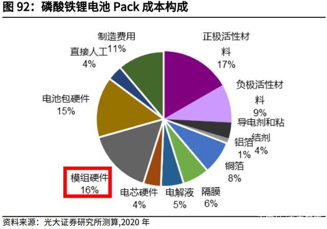 動力電池 Pack 主要由電芯、模組硬件、電池包硬件構(gòu)成。據(jù)我們的動力電池 Pack 成本構(gòu)成模型可見,電芯硬件在成本構(gòu)成中占比約不到 5%,模組硬件占 比約 13-16%,因此可以通過整合精裝電芯、模組硬件來達到降低成本的目的。