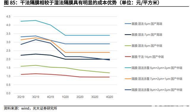 相較于濕法隔膜,干法隔膜抗穿刺強度較高,工序簡單,污染小,固定資產(chǎn)投入 比濕法小,綜合成本較低。因此,在對成本要求低、能量密度要求低(如儲能領(lǐng) 域)、對倍率性能要求高(例如混動車型)的電池中應(yīng)用更為廣泛,隨著磷酸鐵 鋰電池需求回暖和儲能市場的強勁增長,干法隔膜的需求有望持續(xù)增長。