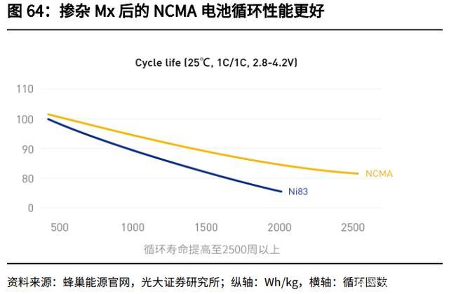 單晶化:目前三元材料多為細小晶粒(直徑幾百 nm)團聚成的二次球形多晶顆 粒(直徑幾 μm 到幾十 μm),多晶三元材料由于顆粒內(nèi)部存在應(yīng)力導(dǎo)致材料循 環(huán)過程中易開裂,而存在循環(huán)壽命短、熱穩(wěn)定性差的缺陷。單晶顆粒(粒徑通常 在 5μm 以下甚至納米級)相對于多晶顆粒,在輥壓時不會破碎,有效地提高了 材料的壓實密度,且單晶顆粒結(jié)構(gòu)穩(wěn)定性好,能在長循環(huán)后保持原狀,提高安全 性能。