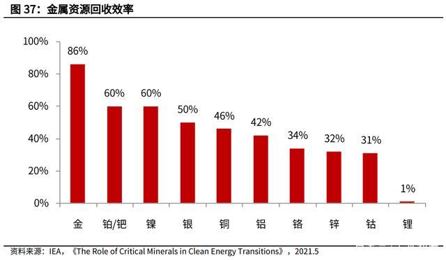 未來,廢舊動力鋰電池回收將會形成一個十分龐大的市場。目前全球?qū)τ阡嚭拖?土資源供給(電池和電機的核心礦物資源),還是圍繞一次資源提取供給為主。 根據(jù) IEA 的報告,當下中鎳、鈷的回收率還可以,但鋰幾乎沒有回收能力(回收 率<1%)。我們可以預(yù)見進入 TGWh 時代后,鋰電池大規(guī)模退役,上游礦物資 源缺口會引發(fā)龐大的回收浪潮。