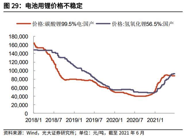 (2)2017-18 年,政策和技術(shù)方向開始逐步三元材料傾斜,對氫氧化鋰的快速 拉動,氫氧化鋰的價格維持在 16 萬元/噸,硫酸鈷的漲價也是始于 2017 年初, 在 2018 年達到頂峰。