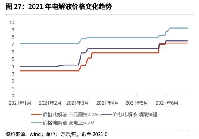 電解液供應(yīng)緊張,尤其受限于上游的 6F、VC 供應(yīng)。2021 年以來,電解液價格 持續(xù)上漲,上游的 6F 價格漲幅大于電解液價格漲幅。根據(jù) wind 數(shù)據(jù),三元圓 柱 2.2Ah/磷酸鐵鋰/4.4V 高電壓電解液價格 2021 年 1 月出的價格為 3.4/4/7.15 萬元/噸,到 2021 年 6 月末,價格已上漲到 7.2/7.5/9.25 萬元/噸,漲幅為 112%/88%/29%;6F 價格 2021 年 1 月初的價格為 11.25 萬元/噸,到 2021 年 6 月末,價格已上漲到 31.5 萬元/噸,漲幅為 180%。