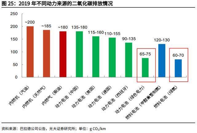 針對于不同車用動力源的全生命周期排碳水平,全球氫燃料電池龍頭巴拉德公司 也進行了測算,其核心結(jié)論在于:能源供給側(cè)的清潔程度是決定因素,無論是鋰 電池汽車還是氫燃料電池車,如果電力或者氫氣來自于化石能源,那么其排碳水 平依然較高。所以若要能源需求側(cè)的汽車使用端減碳,還是需要推動能源供給側(cè) 使用清潔能源。如果能源供給側(cè)均使用清潔能源,那么鋰電池汽車和氫燃料電池 汽車全生命周期排碳水平分別為 65-75 g/km;60-70 g/km。