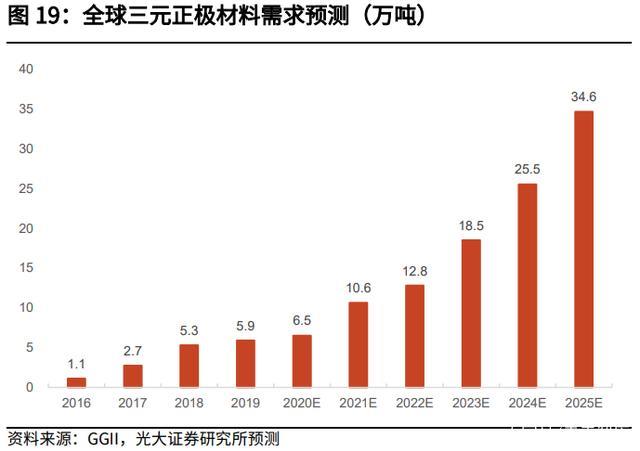 預(yù)計 2025 年全球三元正極材料需求量 34.6 萬噸,磷酸鐵鋰 34.9 萬噸