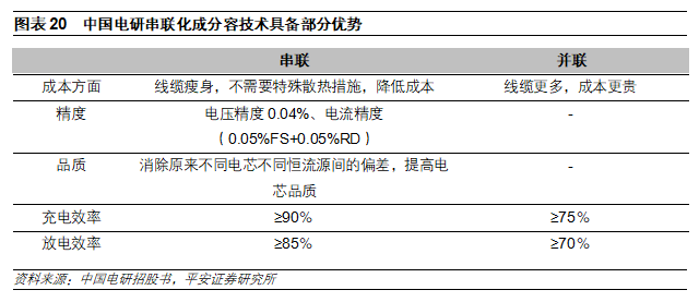 化成分容技術(shù)出現(xiàn)分化。動(dòng)力電池后段化成分容設(shè)備一直采用并聯(lián)技術(shù)。2021年2月,中國(guó)電研宣布在行業(yè)內(nèi)首創(chuàng)的多串串聯(lián)化成分容電源設(shè)備研制成功并投入使用。