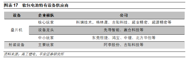 布局疊片機(jī)技術(shù)的設(shè)備商有望崛起。目前疊片機(jī)供應(yīng)商包括先導(dǎo)智能、科瑞技術(shù)、格林晟、吉陽(yáng)科技、超業(yè)精密等。隨著軟包電池占比的提升,同時(shí)越來(lái)越多的電池廠(chǎng)家采用疊片工藝(如比亞迪、蜂巢等),疊片機(jī)市場(chǎng)即將爆發(fā),布局疊片機(jī)技術(shù)的設(shè)備商有望崛起。