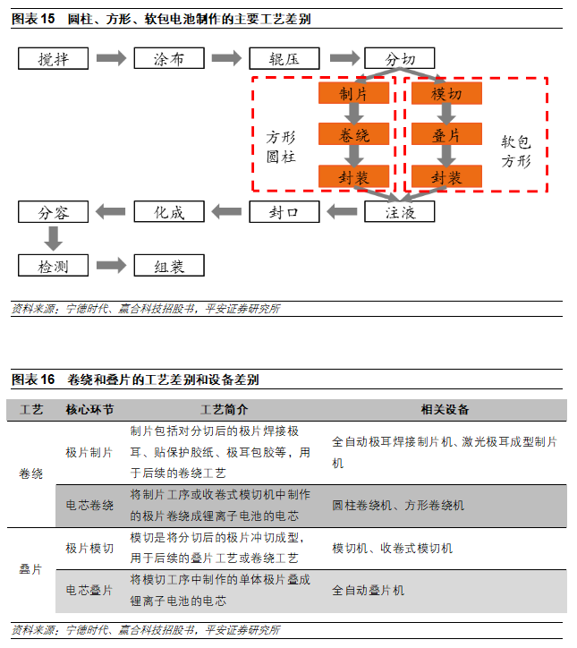 不同的工藝對(duì)應(yīng)的設(shè)備也存在差別,體現(xiàn)在兩方面:一是,卷繞工藝包括極片制片和電芯卷繞兩道環(huán)節(jié),需要用到制片機(jī)和卷繞機(jī);而疊片工藝包括極片模切和電芯疊片兩道環(huán)節(jié),需要用到模切機(jī)和疊片機(jī)。二是,卷繞工藝和疊片工藝后道的封裝工藝不一樣,其設(shè)備存在差異。