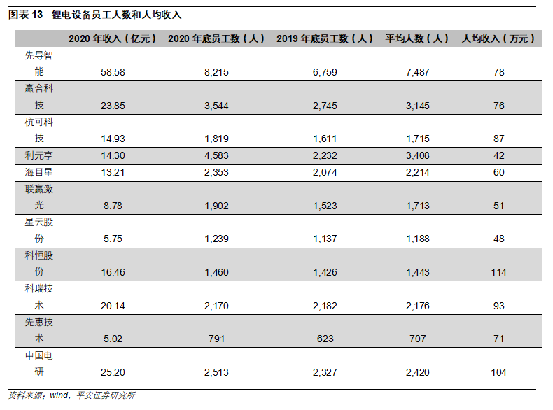 鋰電設(shè)備行業(yè)供不應(yīng)求,行業(yè)出現(xiàn)大規(guī)模招人現(xiàn)象。鋰電設(shè)備行業(yè)屬于非標(biāo)自動(dòng)化行業(yè),對(duì)工程師有要求,人均產(chǎn)值存在天花板。據(jù)我們測(cè)算,2020年各家鋰電設(shè)備公司人均收入為75萬(wàn)元。在行業(yè)供不應(yīng)求的背景下,各家鋰電設(shè)備公司開(kāi)啟新一輪招人計(jì)劃。