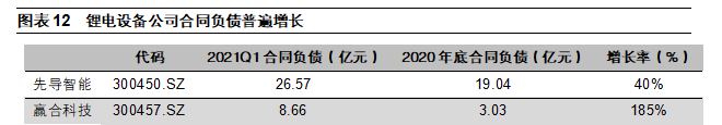 2021年以來(lái)鋰電設(shè)備企業(yè)在手訂單飽滿(mǎn),部分企業(yè)合同負(fù)債創(chuàng)新高。2021年以來(lái),隨著動(dòng)力電池加速擴(kuò)產(chǎn),鋰電設(shè)備行業(yè)回暖跡象顯著。2021年Q1,各家鋰電設(shè)備公司合同負(fù)債相比2020年底大都上升,這表明鋰電設(shè)備公司新簽訂單顯著好轉(zhuǎn)。其中先導(dǎo)智能、贏合科技、星云股份、科瑞技術(shù)等公司合同負(fù)債相比2020年底環(huán)比上升超過(guò)40%。